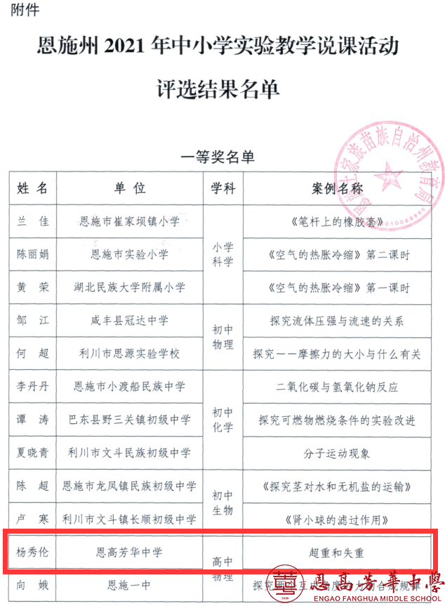 在全州2021年中小学实验教学说课比赛活动中,安博首页高中部物理组杨秀伦老师,生物组程伟老师,化学组吴长宇老师分别获得全州一等奖、全州二等奖、全州三等奖,杨秀伦老师将代表恩施州参加全省说课评选活动。