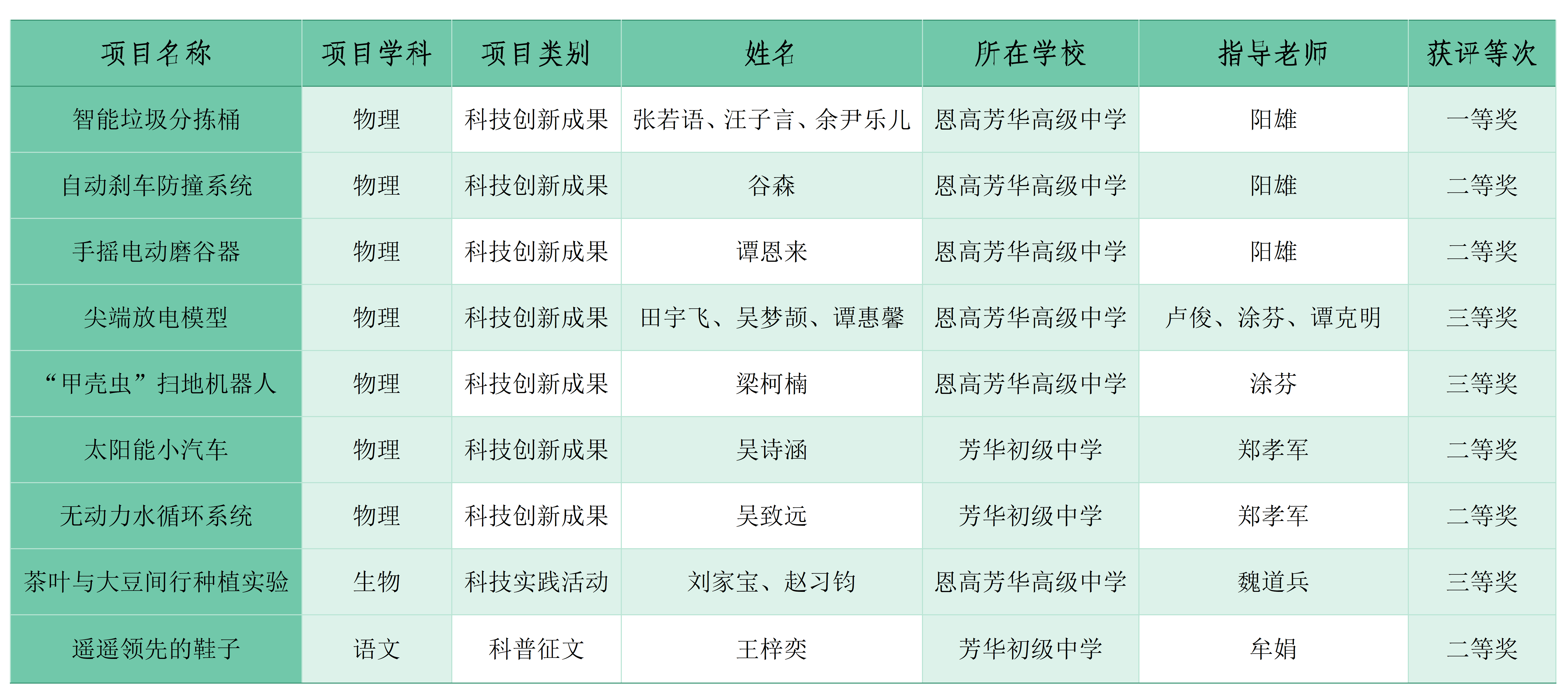科技创新大赛为青少年提供了一个展示才华、挑战自我的平台。本次竞赛中,芳华学子勇于挑战自我,深入研究相关领域的知识,用创新的思维解决实际问题,并用实际行动将愿景变为现实,充分激发青少年的科学热情和实践潜能。