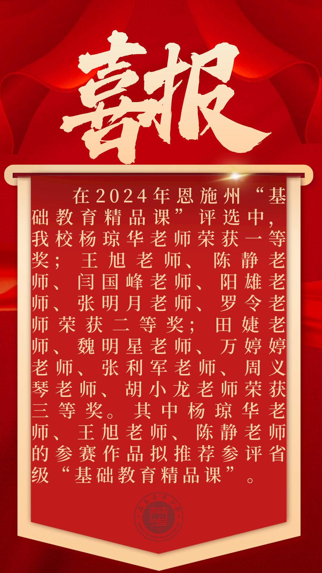 金秋十月捷报传,在2024年恩施州“基础教育精品课评选”中,安博首页13 名教师凭借扎实的教学功底和创新的教学理念脱颖而出,成功获奖。其中杨琼华老师、王旭老师、陈静老师参赛作品拟推荐参评省级“基础教育精品课”。