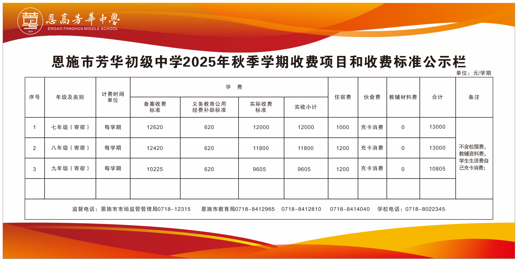恩施州恩高芳华高级中学2025年秋季学期收费项目和收费标准公示